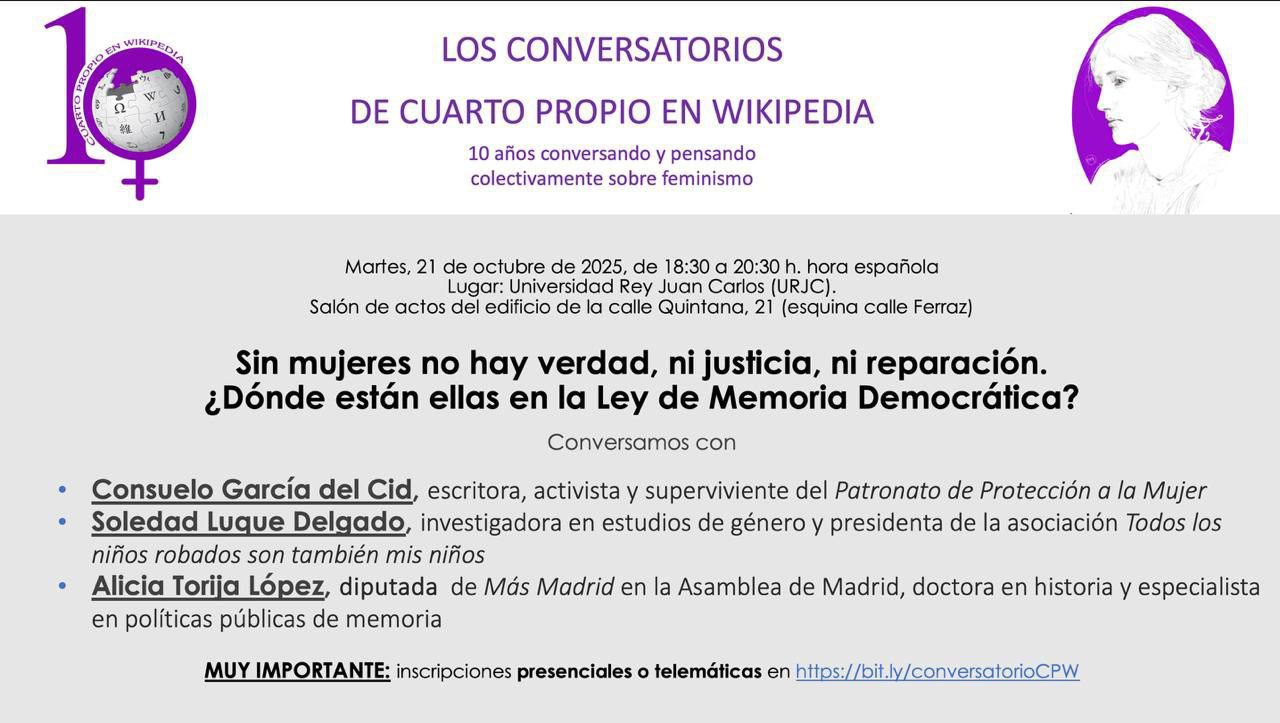 ¿De qué trata?Un espacio de reflexión crítica sobre la Ley de Memoria Democrática desde una perspectiva feminista. Nos preguntamos: ¿dónde están las mujeres en la memoria oficial? Organiza: Cuarto Propio en Wikipedia (CPW) Fecha y hora: 21 de octubre de 2025, 18:30 h Lugar: Universidad Rey Juan Carlos (C. de Quintana, 21, Moncloa - Aravaca, […]
